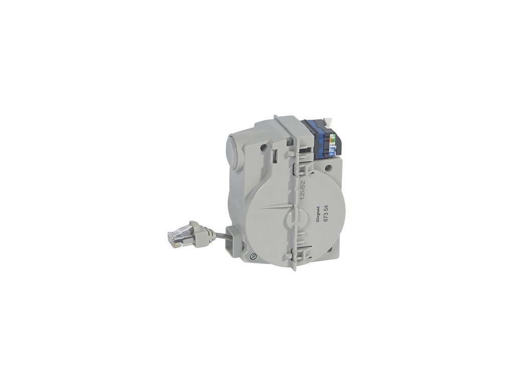 Dátová zásuvka RJ 45 Cat.6 UTP s patch káblom. Dátová zásuvka s integrovaným samonavíjacím patch káblom (1m). Vhodná najmä do hotelových izieb.